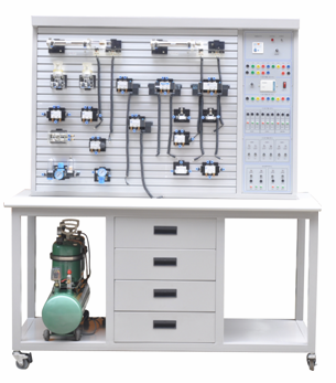 产品详述: 主要特点 1、气动PLC控制实训装置主要由实训桌及实训台、气动元件和电气控制器件、可编程控制器(PLC)等组件组成。 2、配备工业用常用气动元件,且均配有过渡底板(塑料底板6.5*8cm),可方便